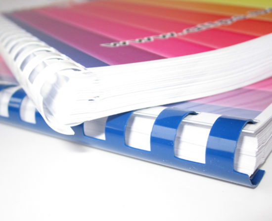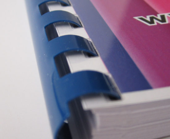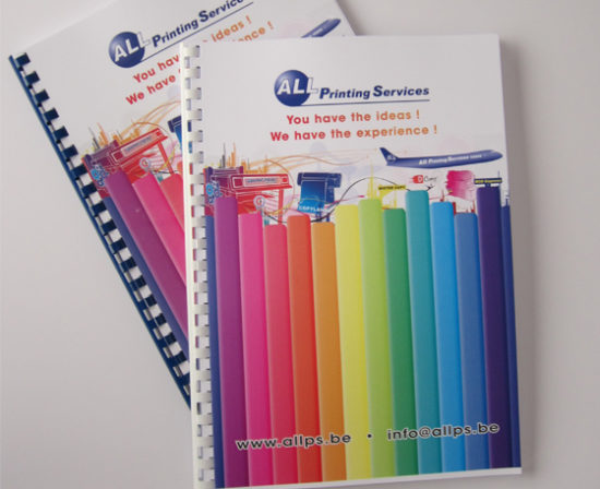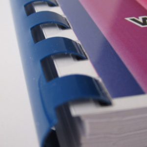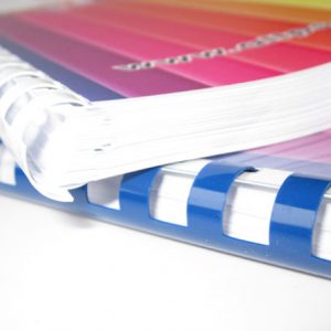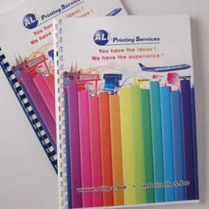 Het is aan te raden niet meer dan 400 vellen met een plastieken spiraal in te binden. Meestal wordt de brochure gekopieerd of digitaal geprint, dit kan zowel in recto (1 pagina per vel) als in recto-verso (2 pagina’s per vel). De geprinte of gekopieerde vellen kunnen direct geperforeerd en ingebonden worden. Indien men kopieert of print kan men de brochure met plastiek spiraal direct afwerken, dit vanaf 1 exemplaar. Kiest men om de vellen te drukken dan moet een droogtijd voorzien worden.